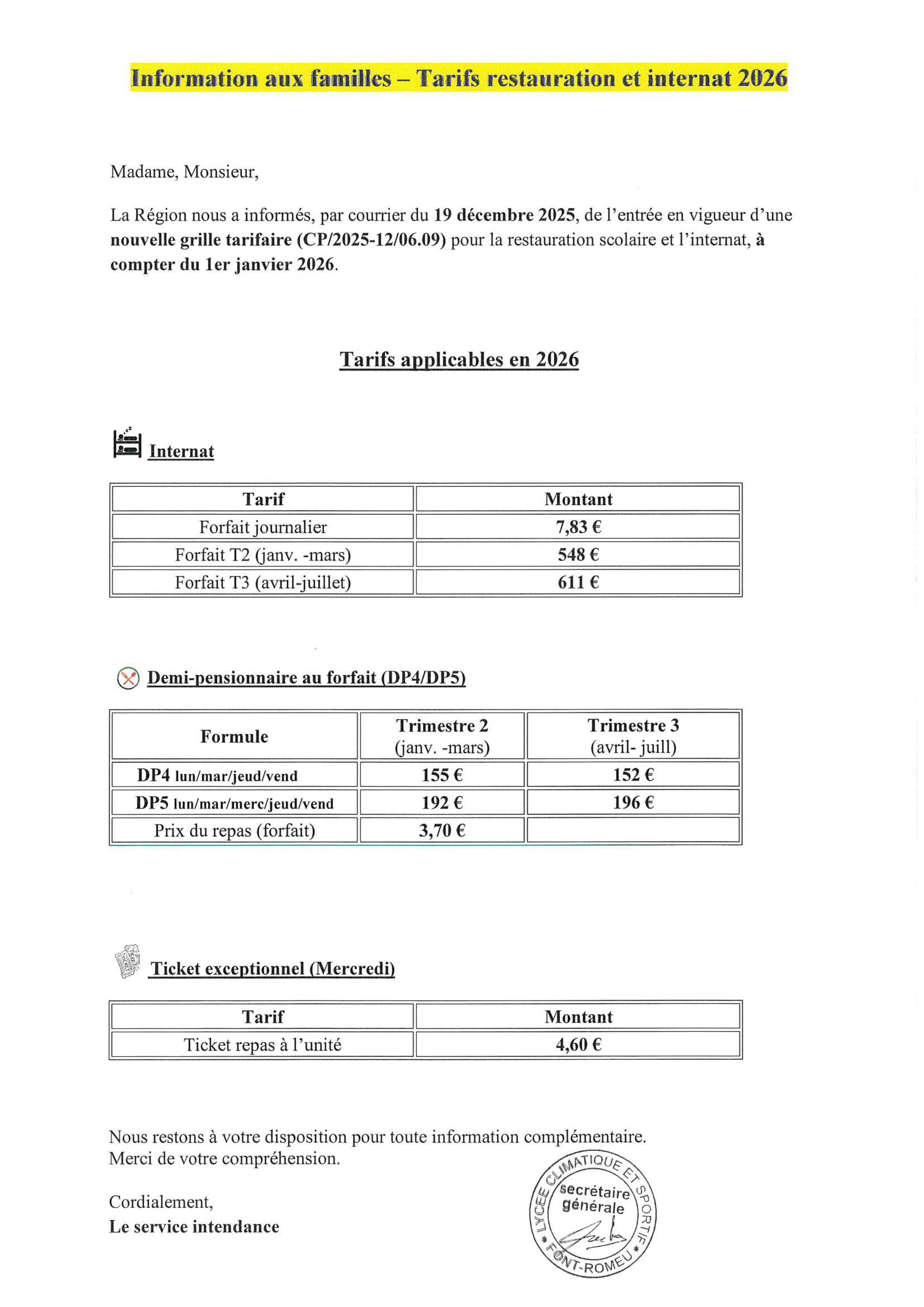 COLLEGE - Evolution de la tarification pour la demi-pension et l'internat
